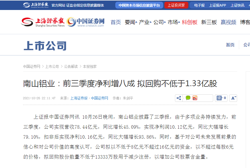 證券日報:大手筆回購彰顯信心 南山鋁業(yè)回購金額已達2.79億元