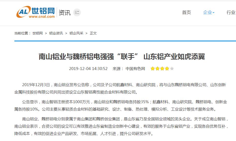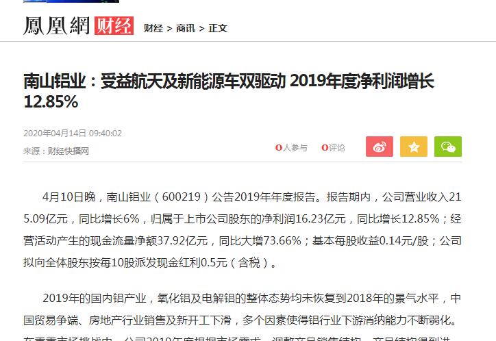 南山鋁業(yè):受益航天及新能源車雙驅(qū)動(dòng) 2019年度凈利潤(rùn)增長(zhǎng)12.85%-鳳凰網(wǎng)